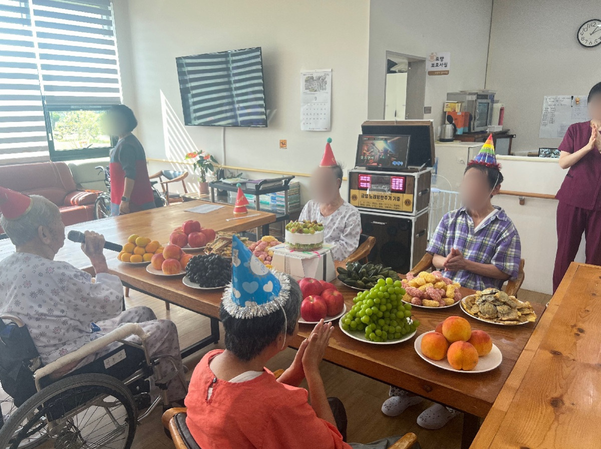 어르신들의 생신을 맞이하여 맛있는 간식과 과일등을 준비하여 생신잔치를 진행하였습니다.